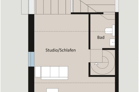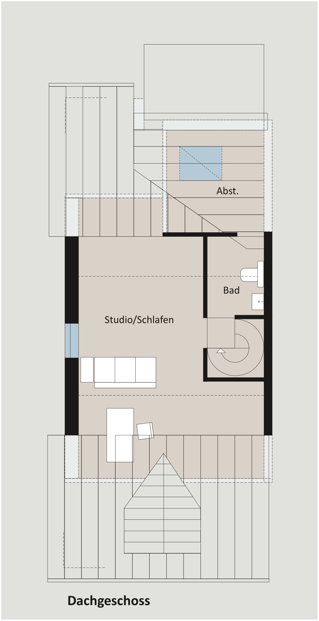 Über eine Wendeltreppe gelangen Sie in die obere Wohnebene. Hier erwartet Sie ein großzügiges Studio-Schlafzimmer mit wohnlichem Charakter. Die Dachschrägen verleihen dem Raum eine besondere Atmosphäre, während ein zusätzliches Giebelfenster für viel Tageslicht sorgt. Ergänzt wird diese Ebene durch ein weiteres, eigenes Badezimmer. Von diesem Badezimmer aus erreichen Sie einen ausgebauten Abstellraum, der mit einem Dachfenster ausgestattet ist. Aufgrund seiner Größe und Belichtung bietet dieser Raum nicht nur komfortablen Stauraum, sondern lässt sich auch flexibel anderweitig nutzen. Ein Stellplatz direkt vor dem Haus rundet das Angebot ab.