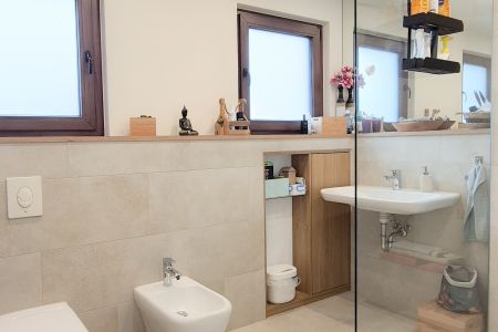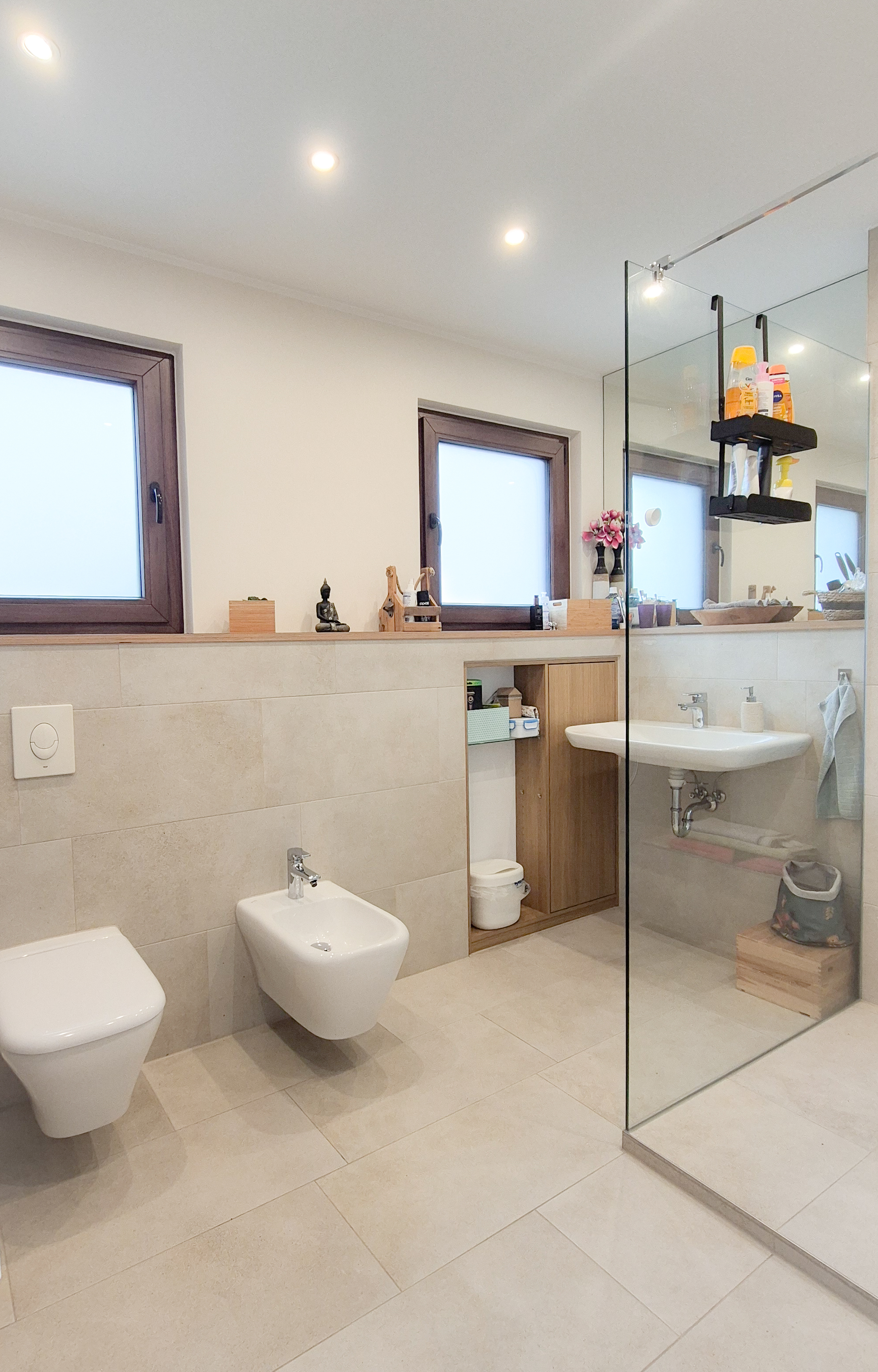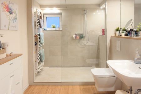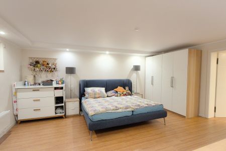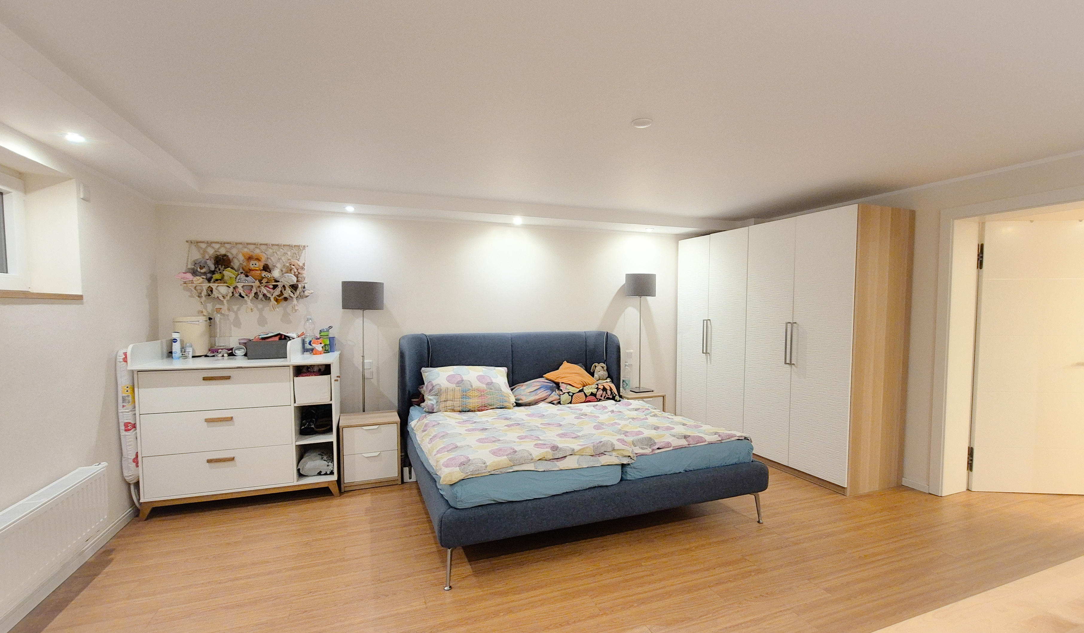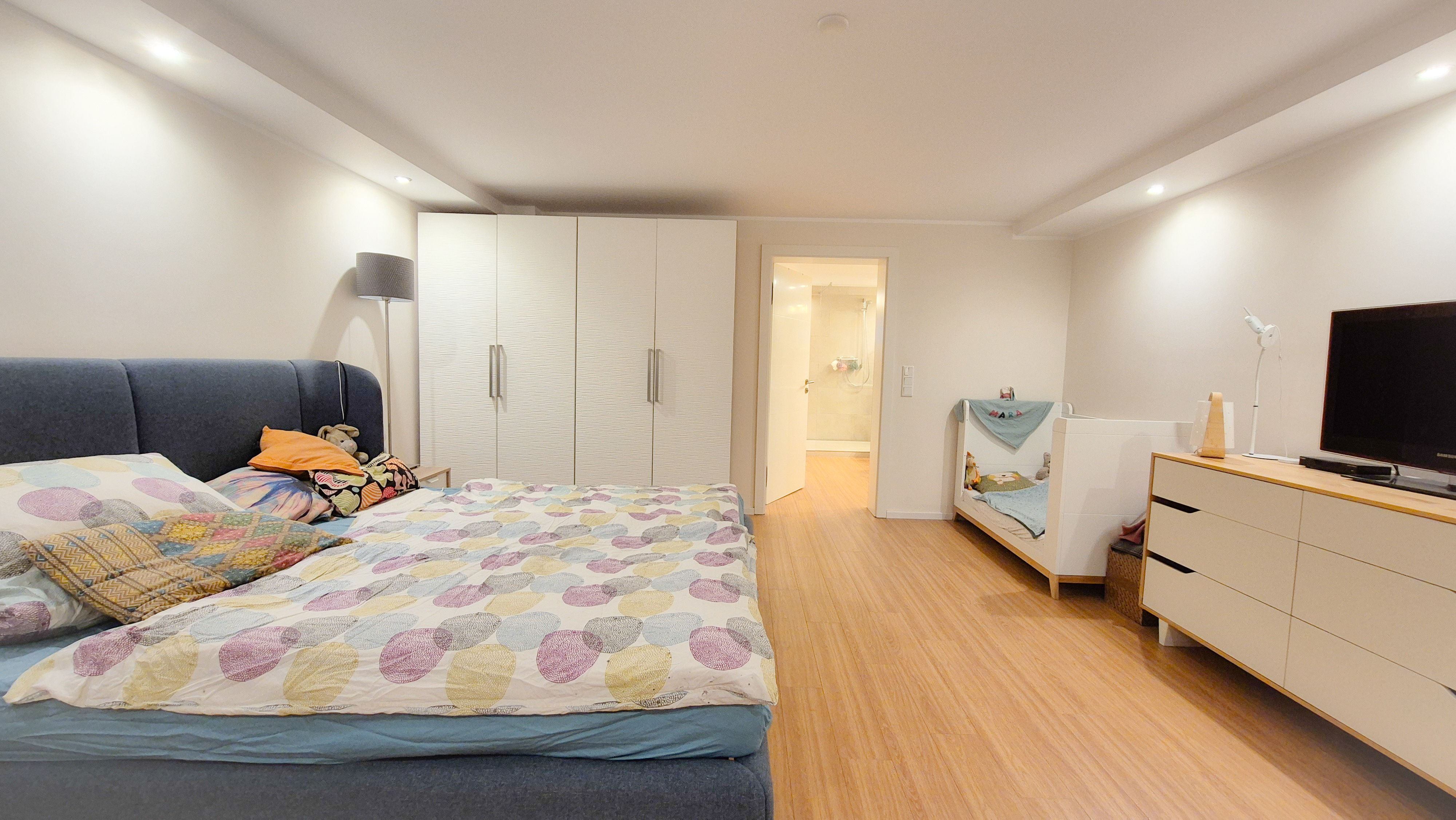 Im Souterrain befindet sich ein großzügiges Schlafzimmer mit angenehmer Belichtung sowie ein En-Suite-Bad mit bodengleicher Dusche, Doppelwaschtisch und Fenster – ein echtes Highlight in Komfort und Design. Ein Vorflur sowie ein großer Wasch- und Trockenraum runden das Raumangebot dieser Ebene ab.