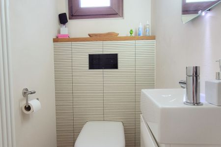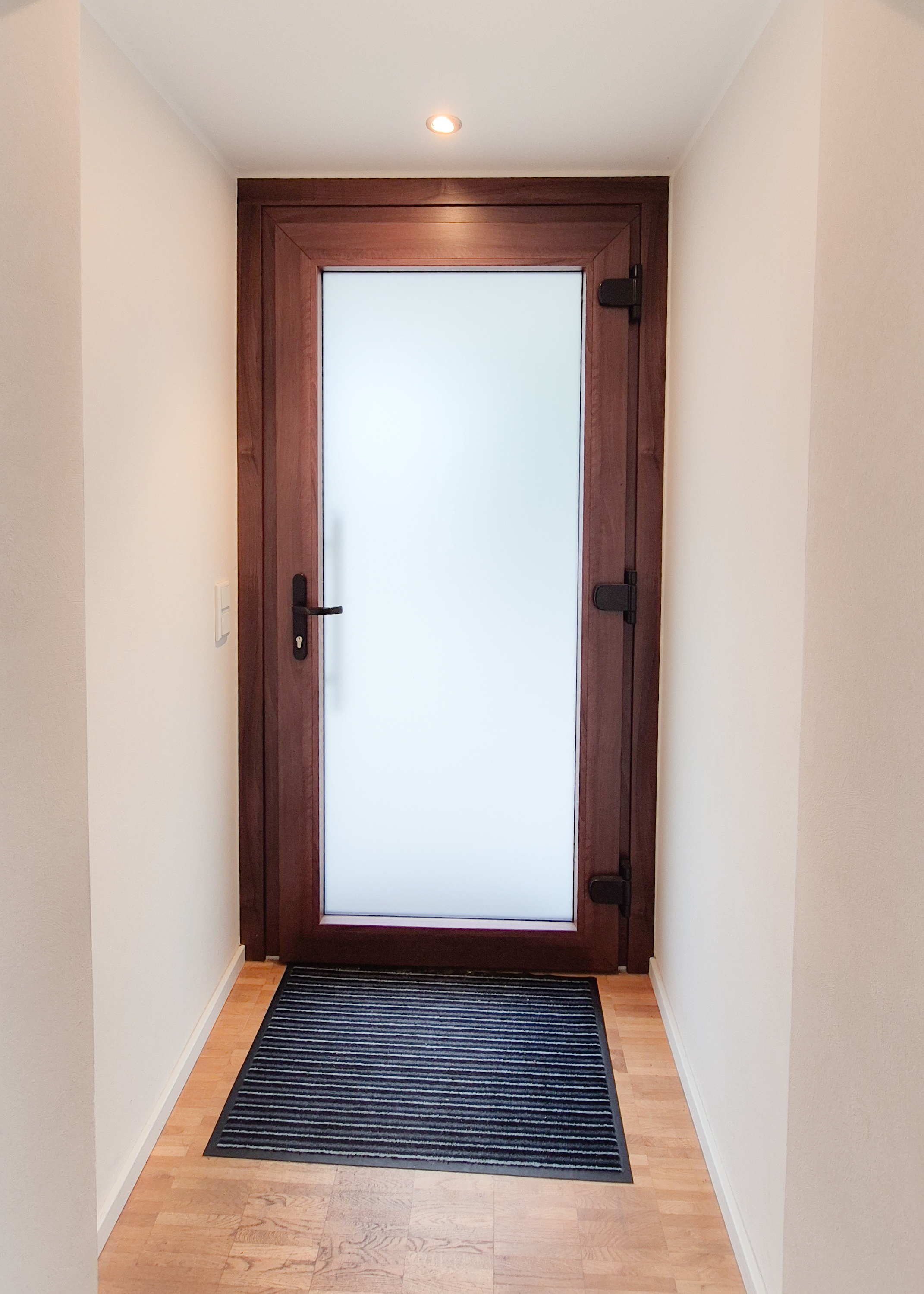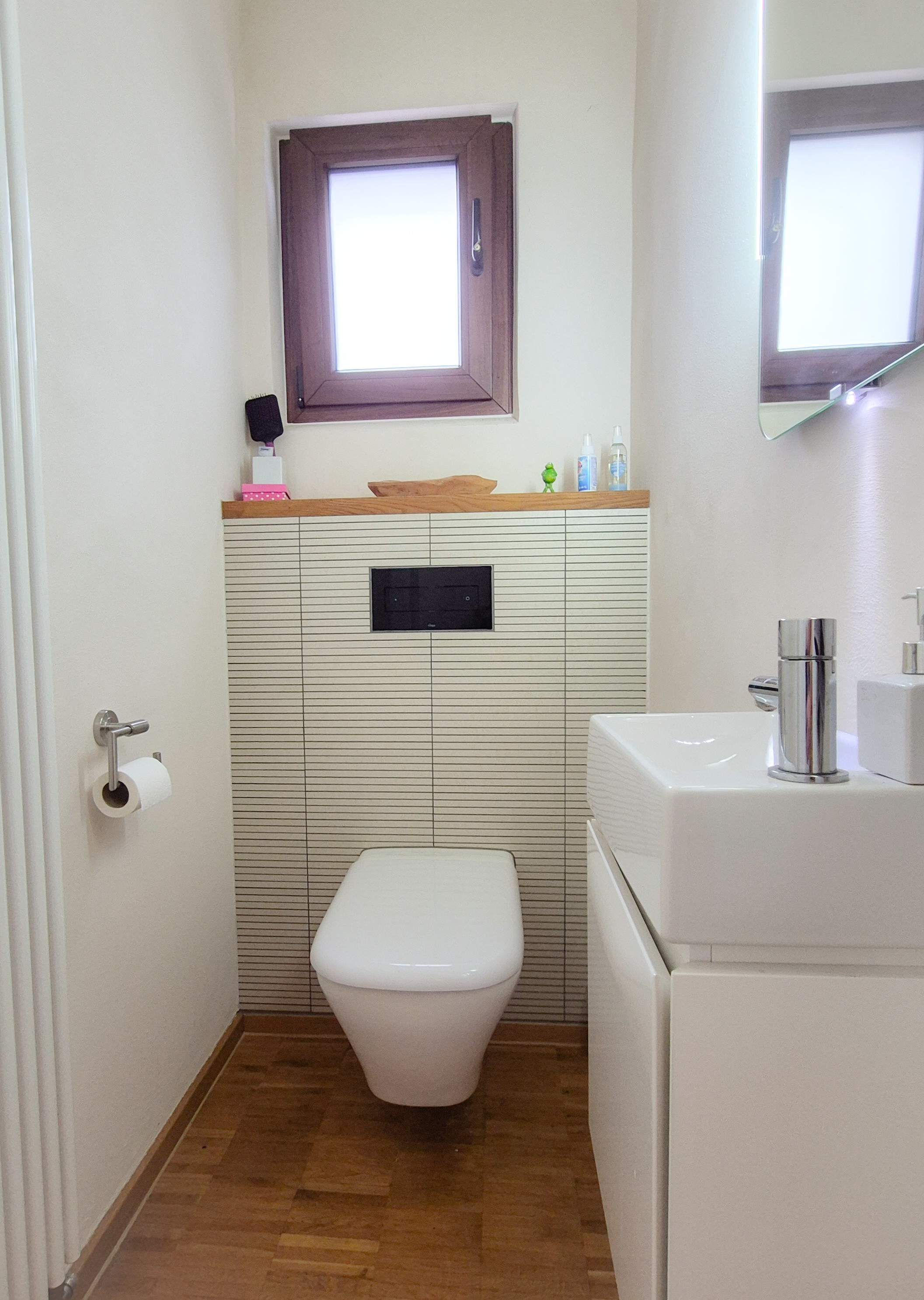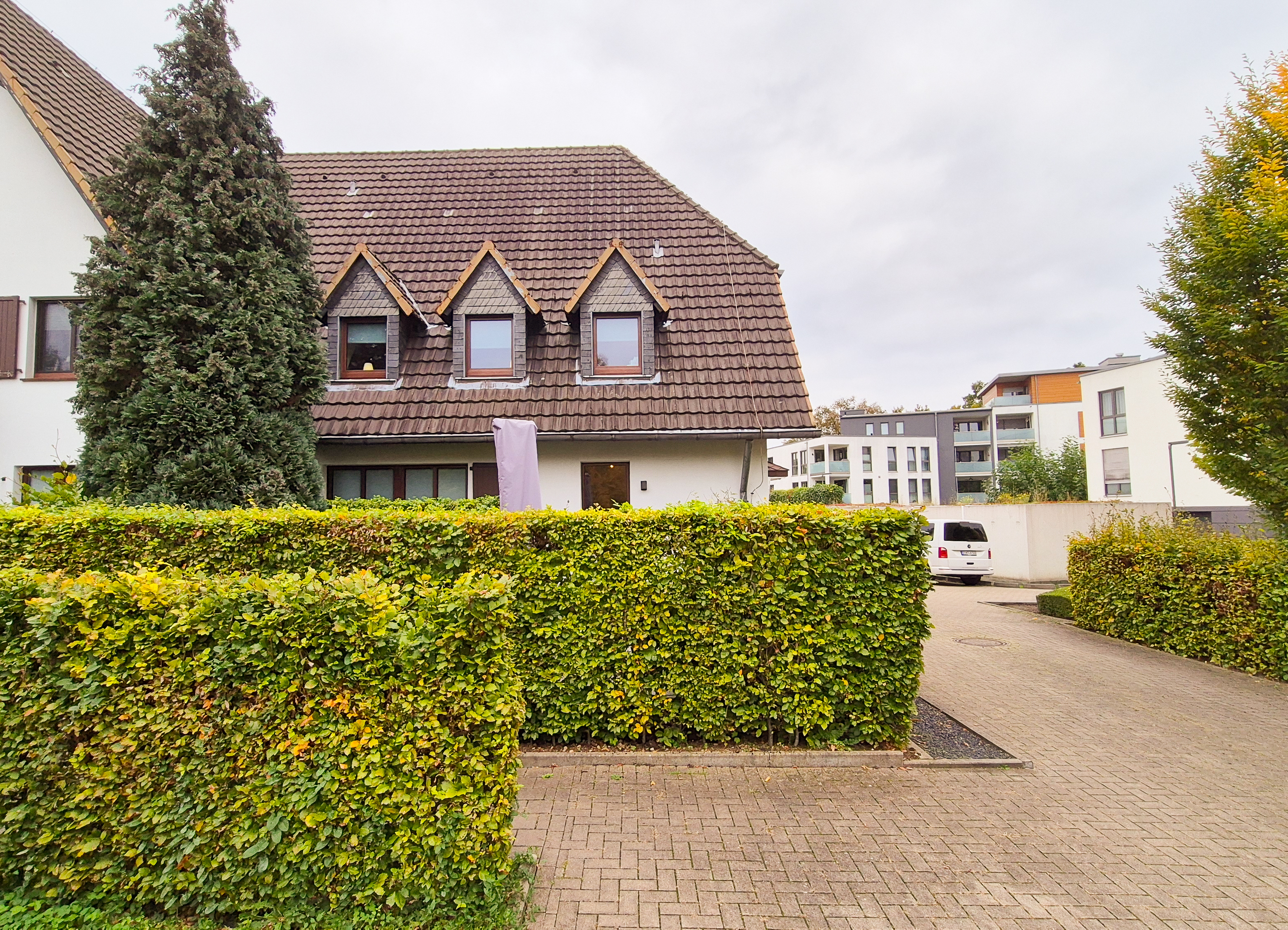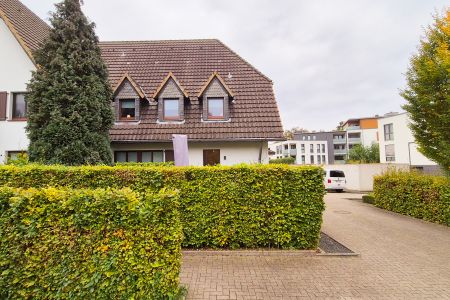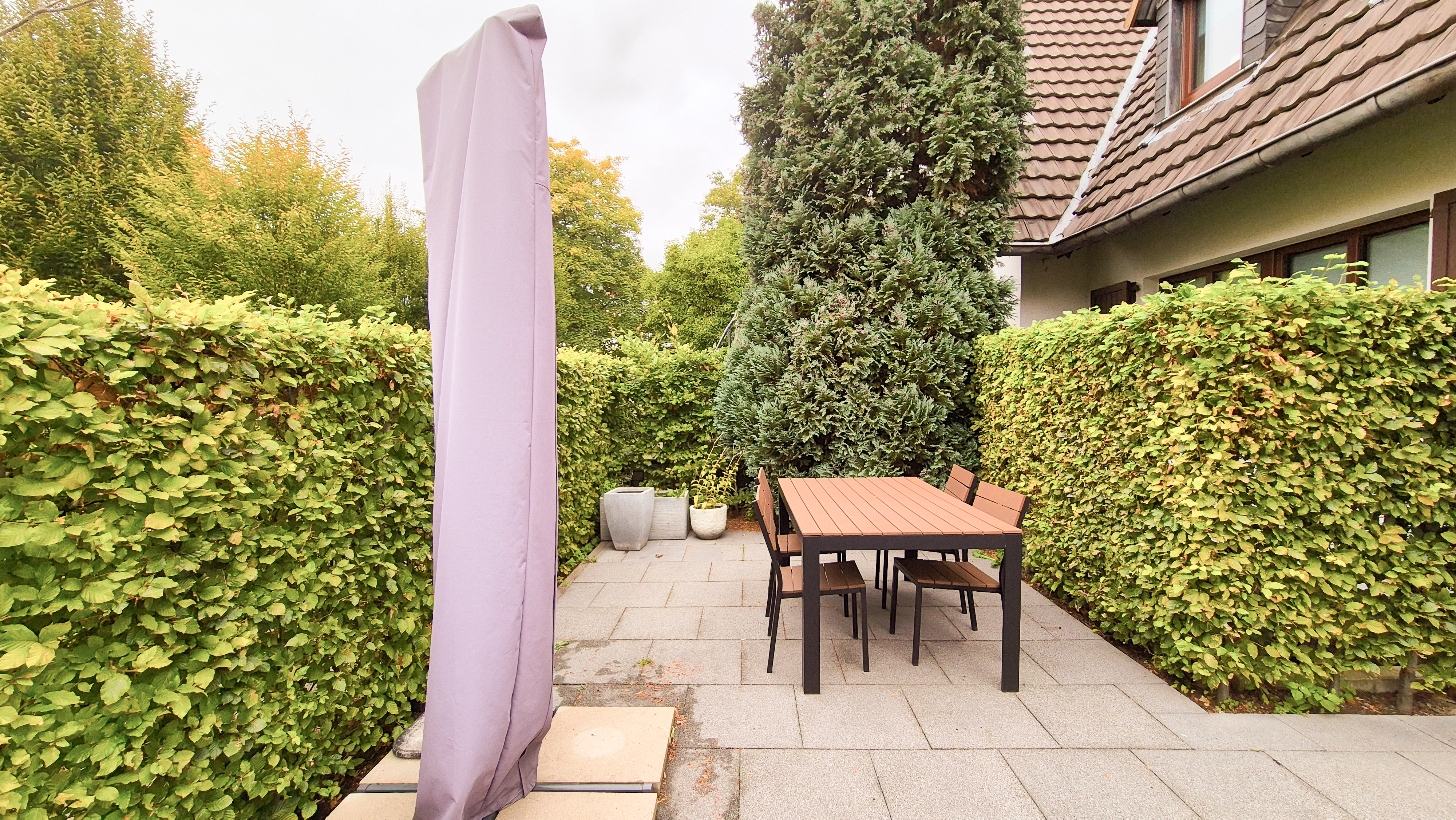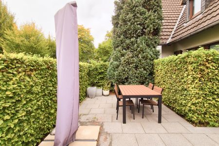Der Zugang zur Wohnung erfolgt über einen eigenen Eingang mit separater Haustür. Von hier gelangt man in den einladenden Flur mit Garderobe, von dem aus sowohl das Gäste-WC als auch die großzügige Garten-Terrasse erreichbar sind. Diese ist von einer gepflegten Hecke eingefasst und bietet einen geschützten Rückzugsort im Grünen.