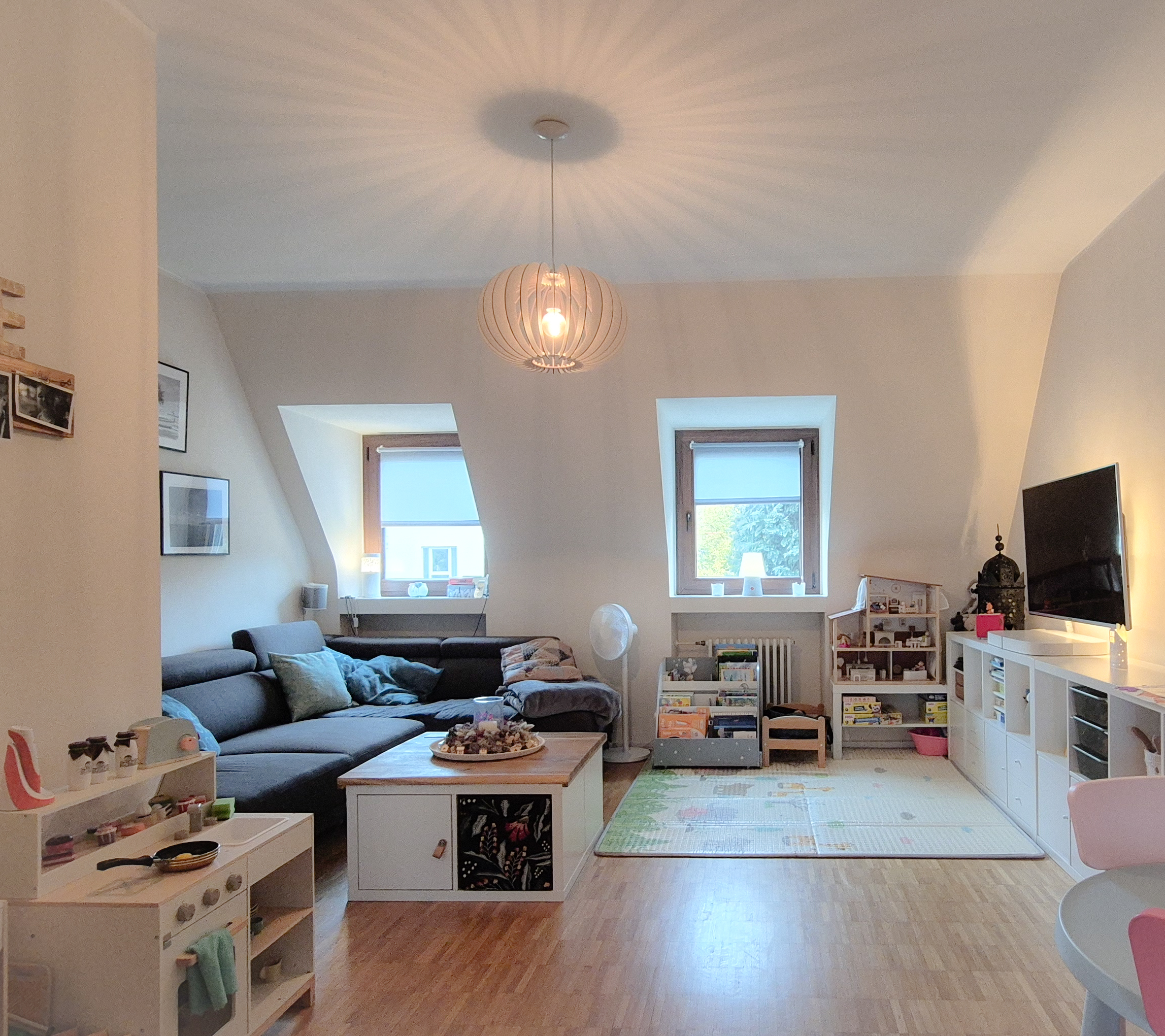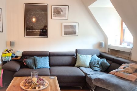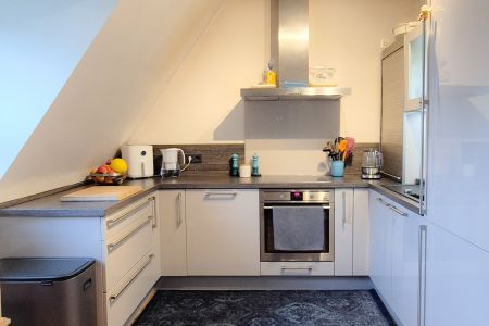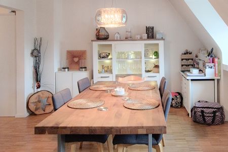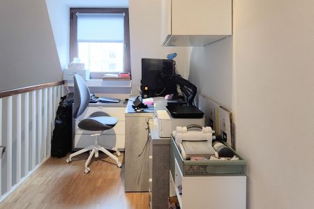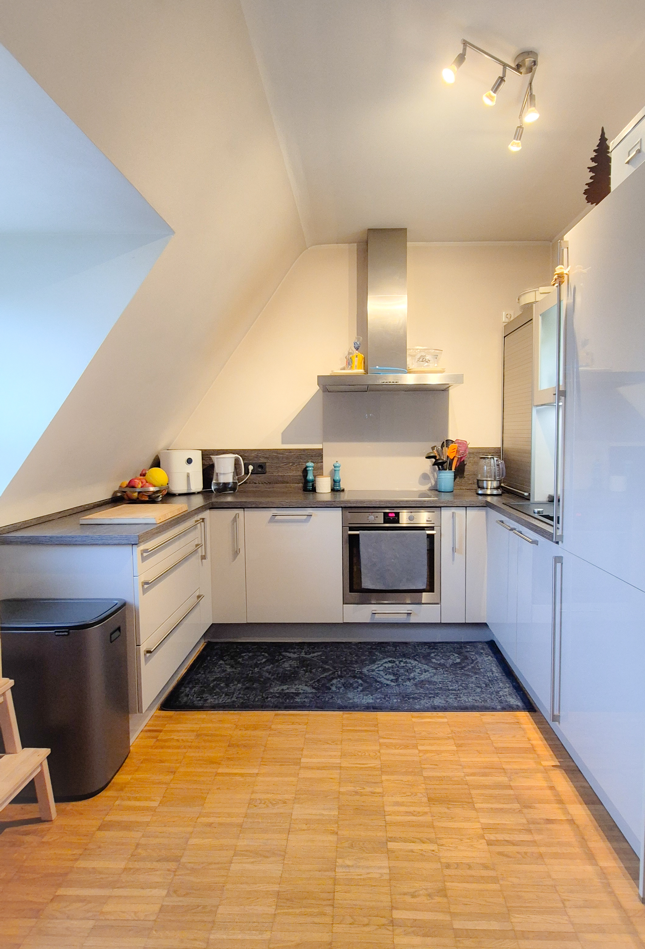 Das Obergeschoss beeindruckt durch seinen besonderen Charme mit kleinen, charaktervollen Dachgauben. Hier liegen das zweite, helle Badezimmer, die Küche mit Durchgang zum Esszimmer sowie der Wohnbereich, der zum Verweilen einlädt. Im Flurbereich ist derzeit ein Arbeitsplatz eingerichtet, von dem aus man einen schönen Blick in das Bärenkamp-Quartier genießt. Ein praktischer Abstellraum ergänzt diese Ebene.