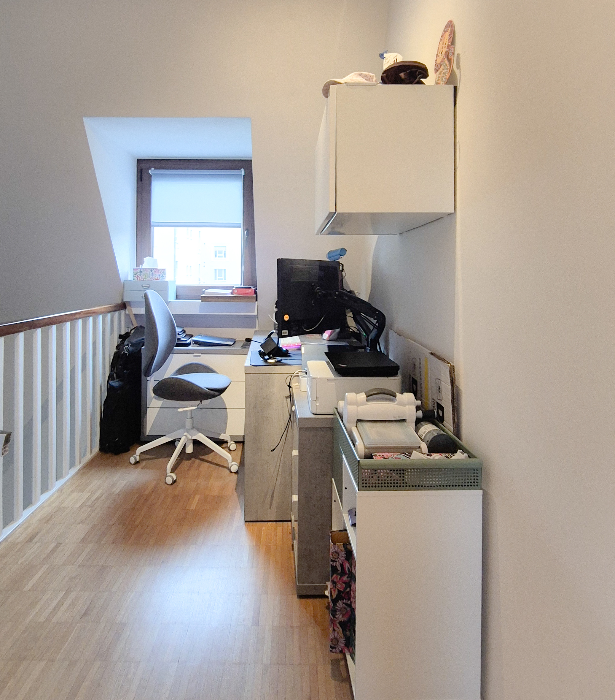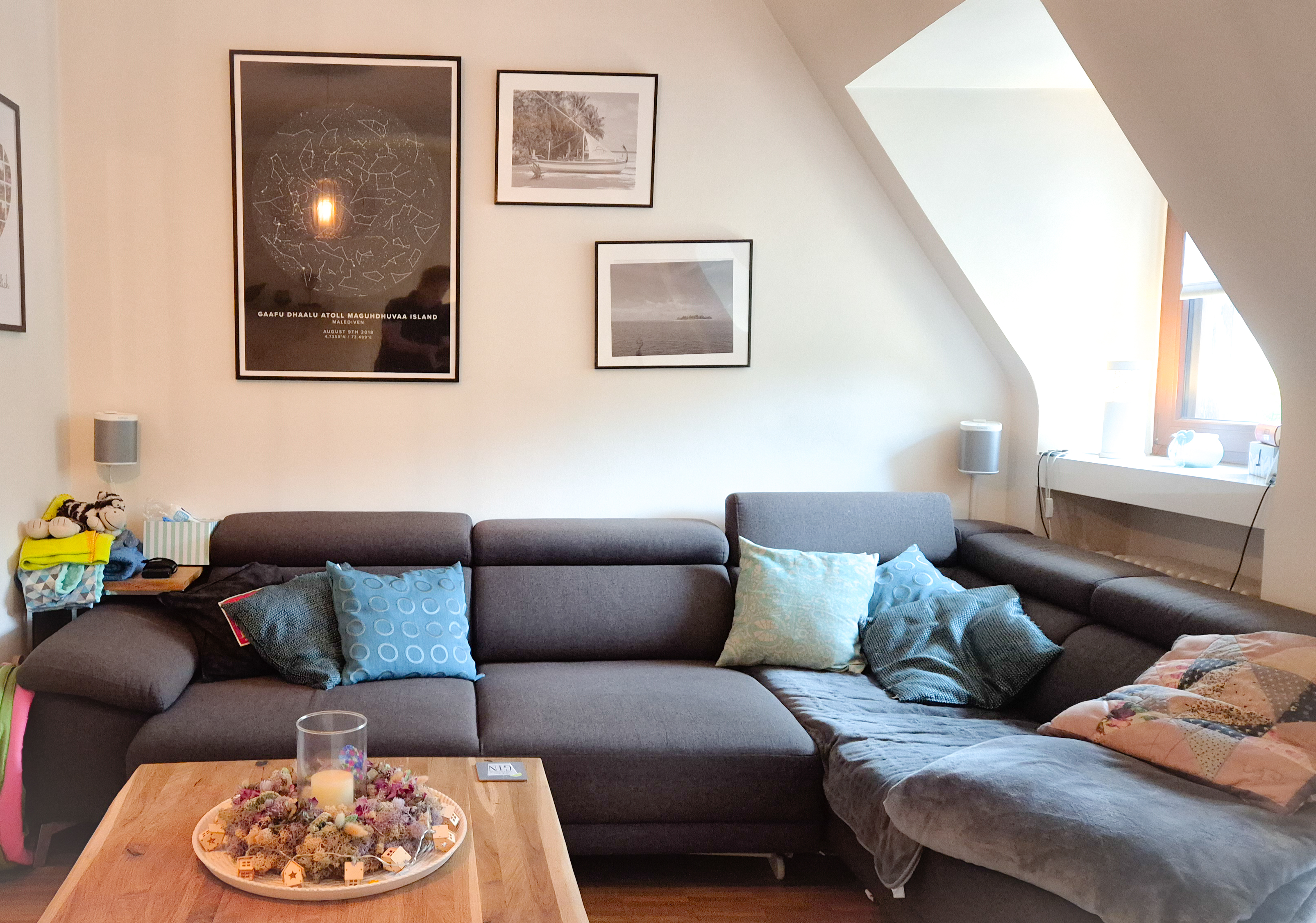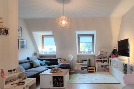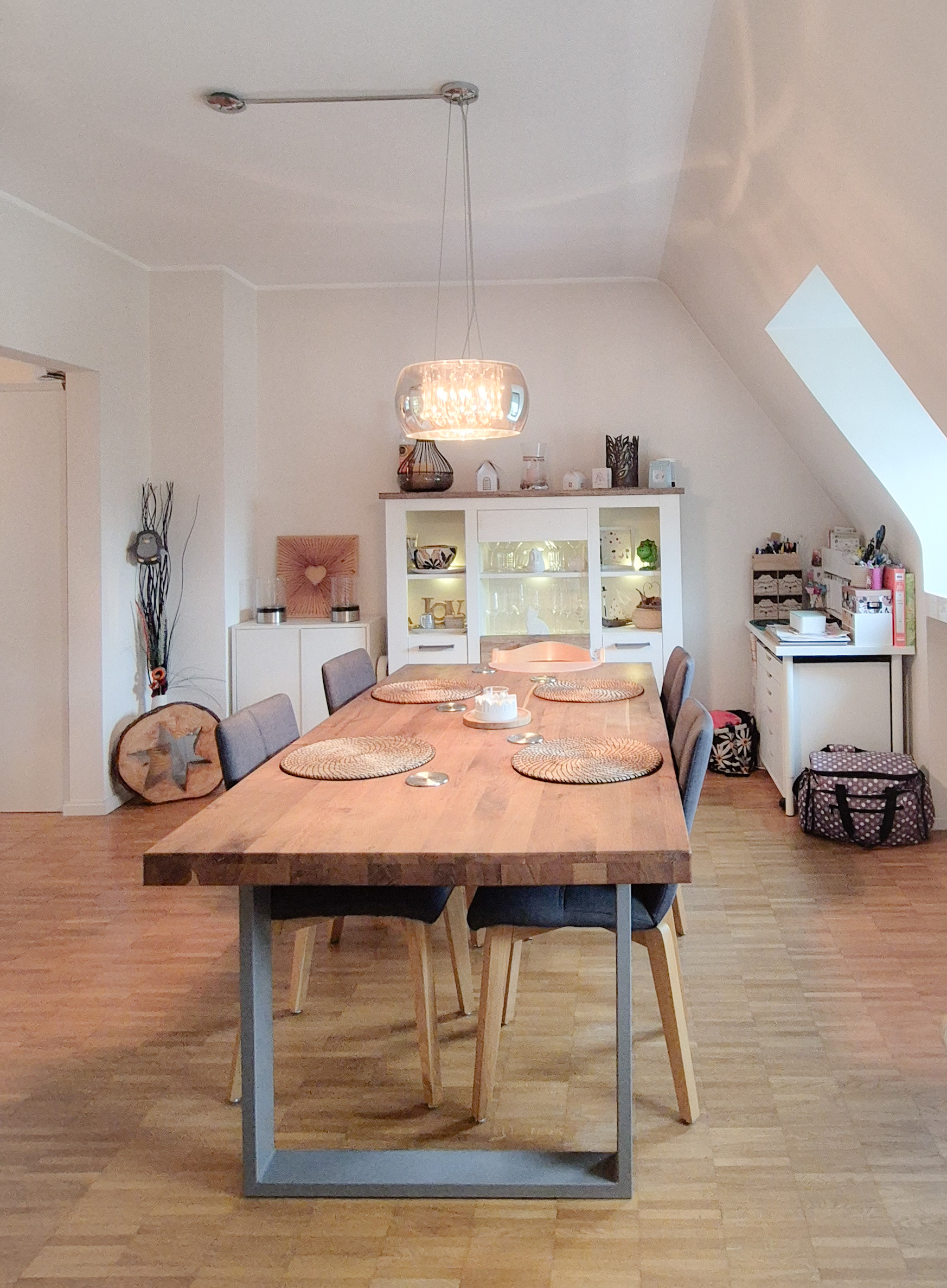 Das Obergeschoss beeindruckt durch seinen besonderen Charme mit kleinen, charaktervollen Dachgauben. Hier liegen das zweite, helle Badezimmer, die Küche mit Durchgang zum Esszimmer sowie der Wohnbereich, der zum Verweilen einlädt. Im Flurbereich ist derzeit ein Arbeitsplatz eingerichtet, von dem aus man einen schönen Blick in das Bärenkamp-Quartier genießt. Ein praktischer Abstellraum ergänzt diese Ebene.
